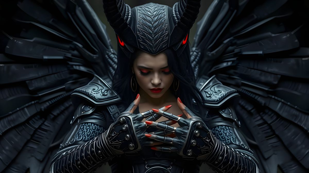 A dramatic image shows a demon cradling a woman's face, their gazes locked. The demon is clad in black and silver armor with large black wings, rendered with hyperrealistic detail and a cinematic, moody atmosphere.