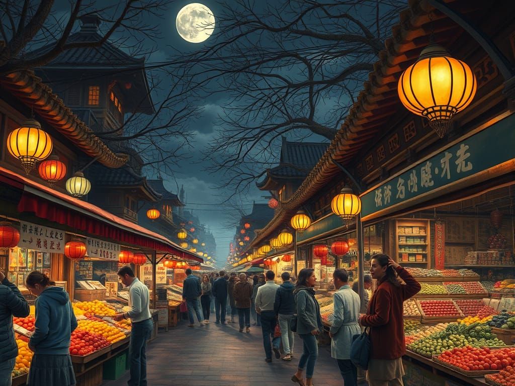 This image captures the essence of a lively night market in an enchanting oriental setting, filled with colorful market stalls, joyful people, and warm romantic lighting.