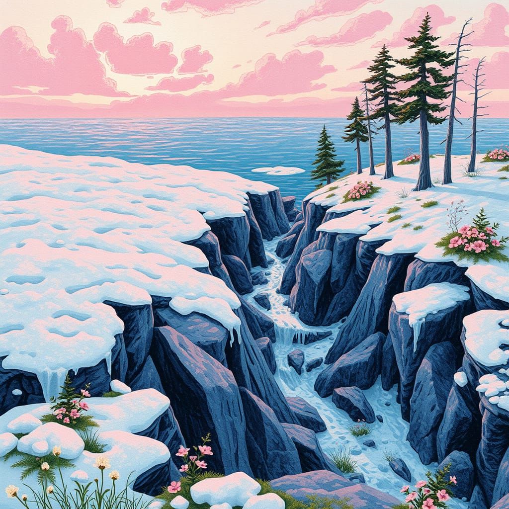 This image shows a breathtaking coastal landscape where winter's chill gives way to spring's vibrant colors, set amidst intricate dot and ink textures and painterly brushstrokes, with neon hues and stylized trees evoking a dreamlike atmosphere.