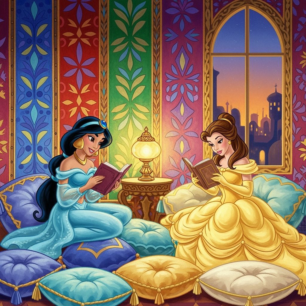 A charming storybook illustration of Princess Jasmine and Belle seated on plush pillows, engrossed in books. The art features vibrant jewel tones and a stylized, whimsical aesthetic.