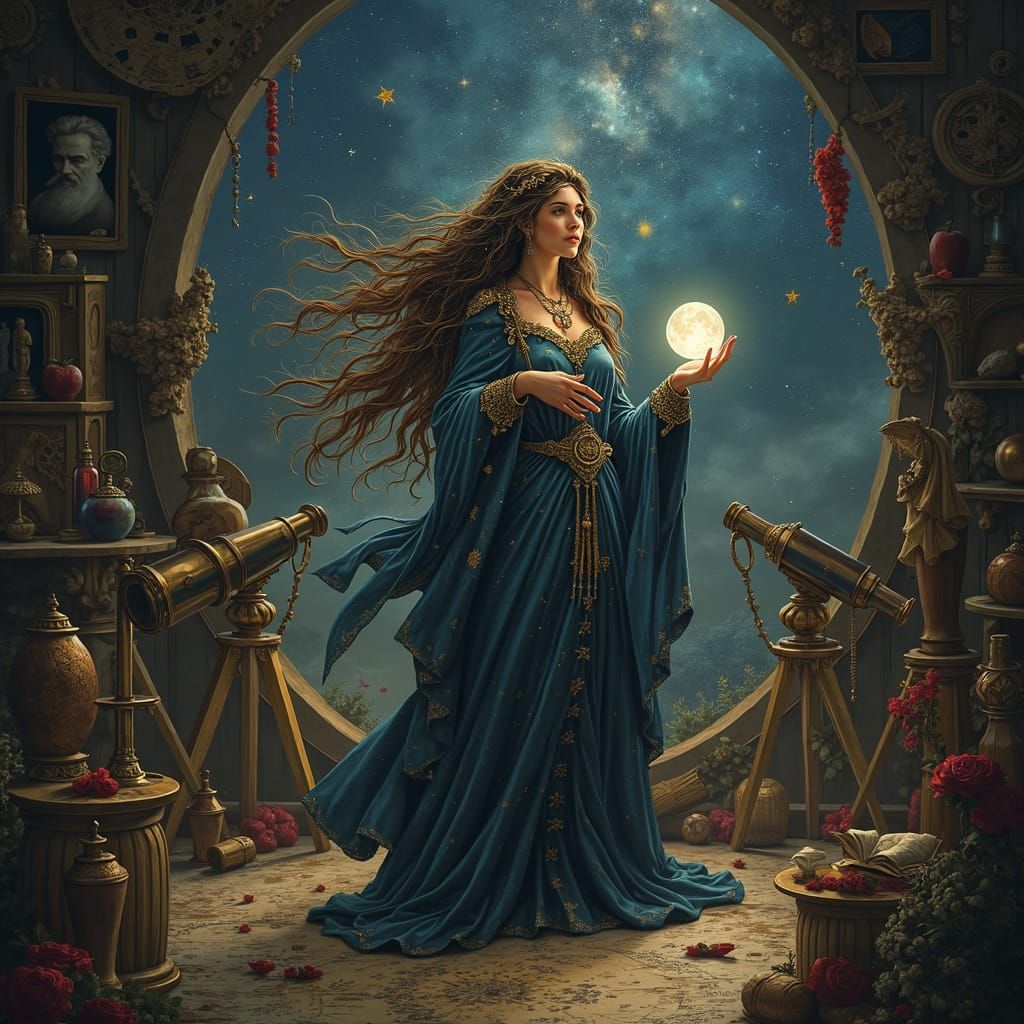 This image shows a cosmic witch with stardust hair and constellation robes holding a crystal ball. She stands in an observatory filled with occult symbols, in a hyperrealistic and ethereal digital art style.