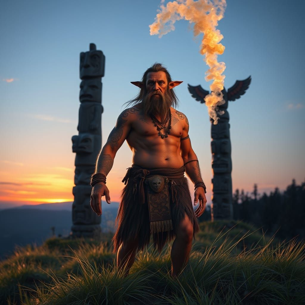 This image shows a bare-chested, tattooed Tauren woman, an elder wearing a fur kilt. She stands in a grassy field with carved totem poles at sunset.