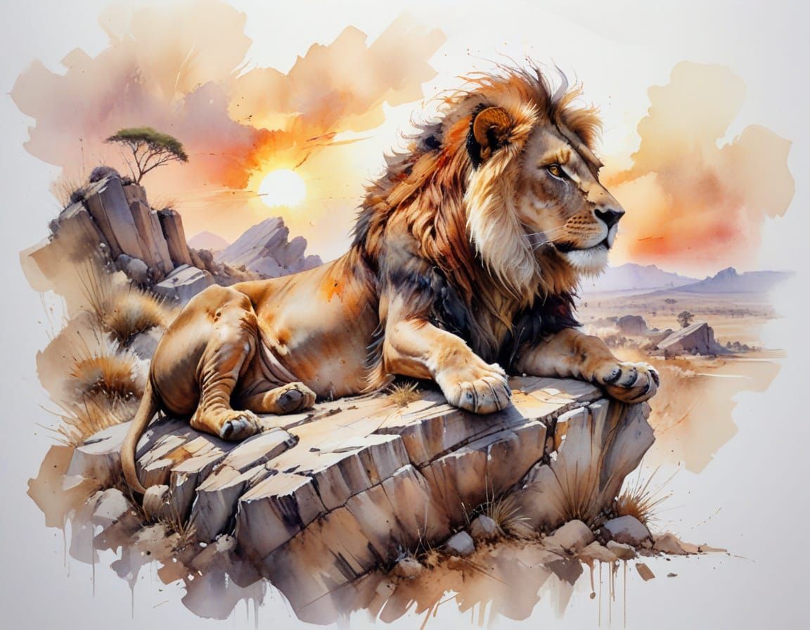 This image shows a powerful African lion resting on a rocky outcrop against a hazy sunset. It features a blend of watercolour techniques and cinematic stylization.