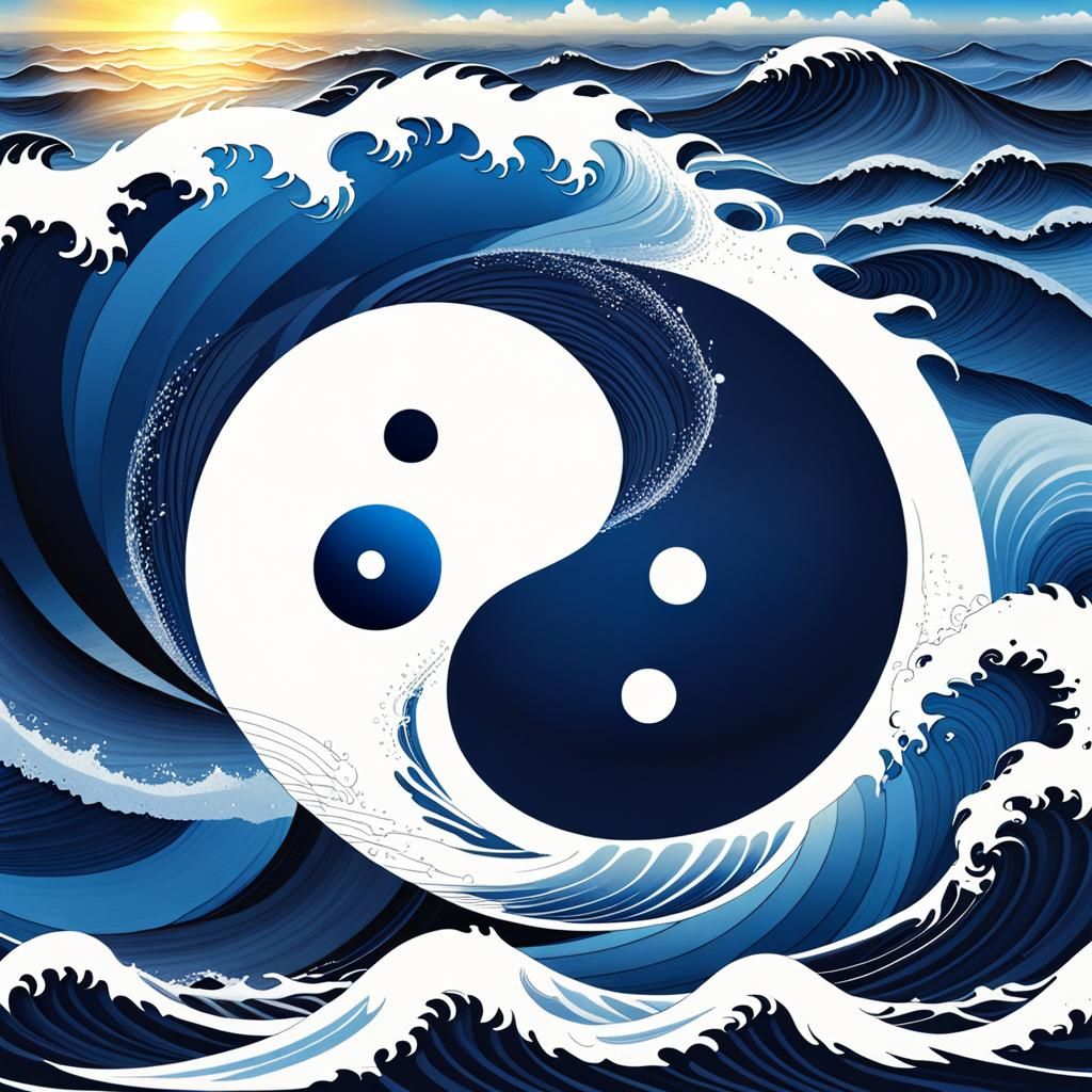 This image shows a Tai Chi yin and yang diagram formed by dark blue and white waves on the sea. The sun shines brightly in the distance, as a detailed matte painting.