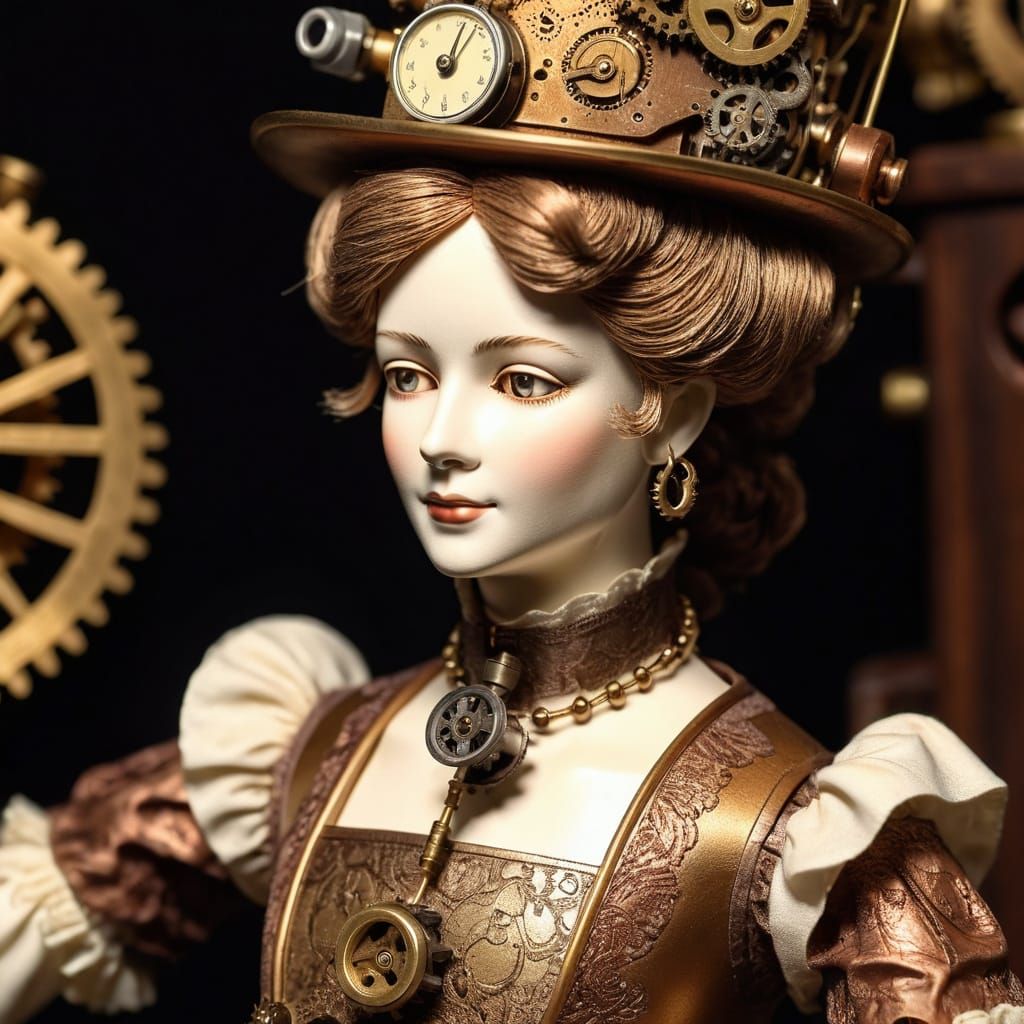 A close-up image of a steampunk automaton resembling an elegant French lady playing music. It showcases rococo style, delicate micro gears, intricate engravings, and warm golden lighting.