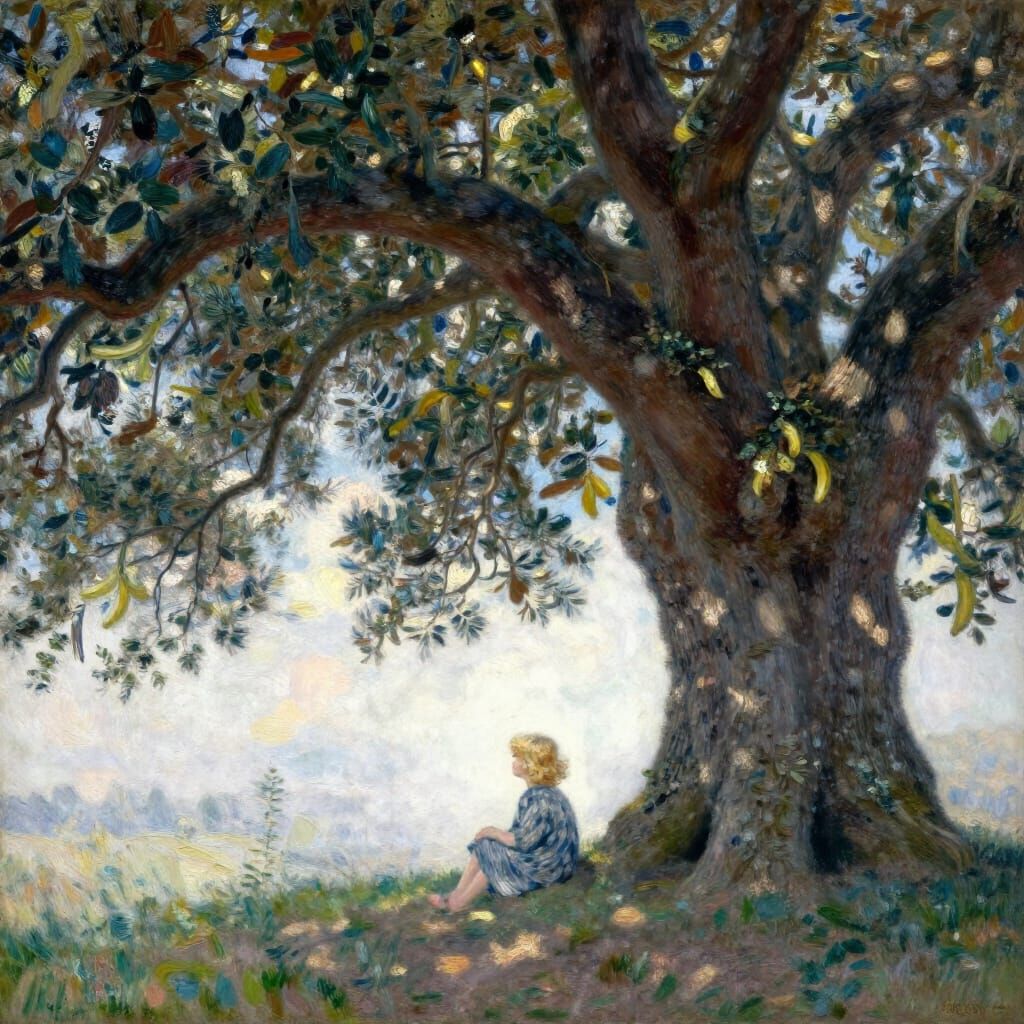 A solitary child with blonde curls rests under a massive, ancient oak tree with branches reaching for a summer sky. The image features soft lighting and visible brushwork, evoking peaceful contemplation in an impressionist aesthetic.