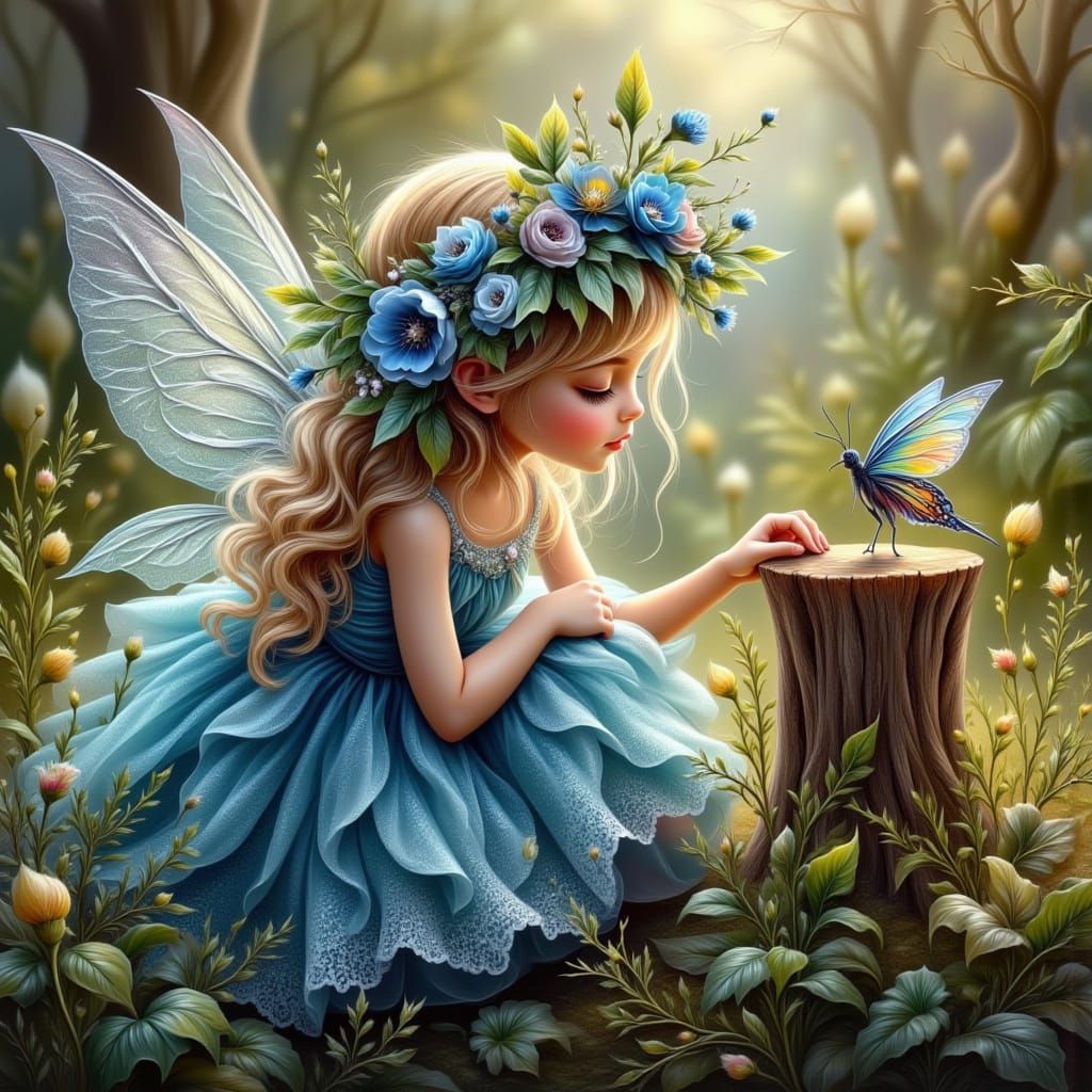 This image shows a fairy girl in a pink dress talking to a butterfly in a sun-dappled forest. Rendered in a whimsical, illustrative style with soft, painterly textures.