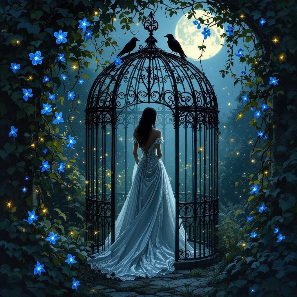 A solitary woman in a silver gown is trapped in an ornate cage within a moonlit, overgrown garden. Luminous blue flowers and fireflies add an ethereal glow to the dark, romantic scene.