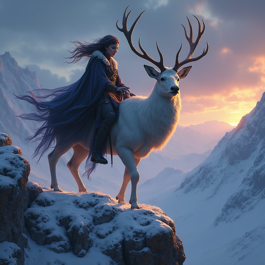 This image depicts the Celtic goddess Cailleach riding a massive white stag deer on a rugged mountain peak, set against a backdrop of vibrant purple and yellow hues, with dynamic, hyper-detailed elements reminiscent of dark fantasy concept art and Art Nouveau flair.