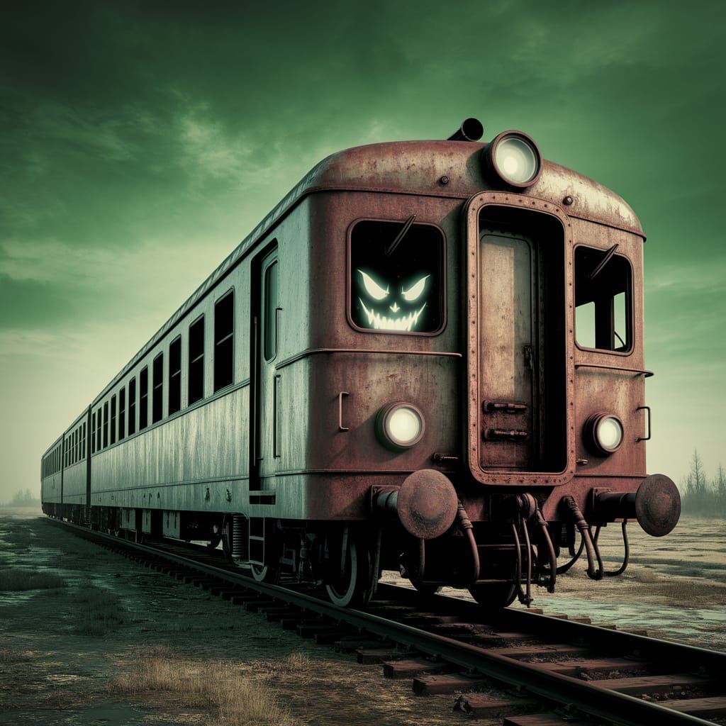 This image shows an abandoned, rusted train carriage in a desolate wasteland under a green sky. Its headlights glow ominously, giving it an evil face. Rendered realistically with gritty textures, it evokes dread and isolation.