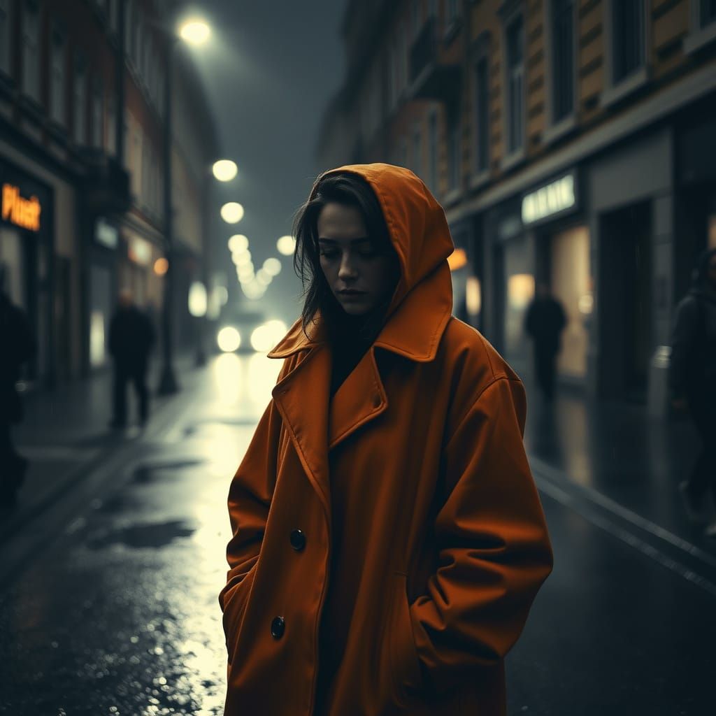 This image shows a heartbroken woman in an orange coat standing in the rain under streetlights. The grayscale image has vibrant orange accents and a cinematic, moody atmosphere.