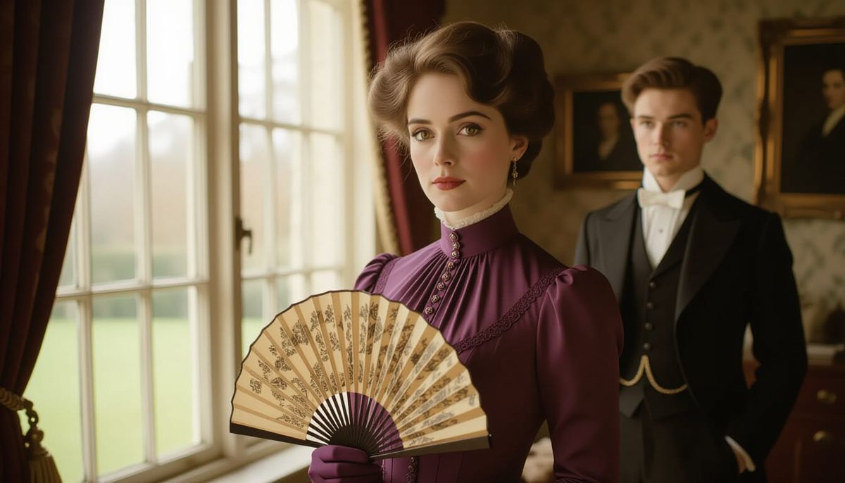 A cinematic image of a dark-haired woman in an Edwardian gown, holding a fan in a parlor. A young man stands behind her, gazing out the window, with dramatic lighting and warm colors.