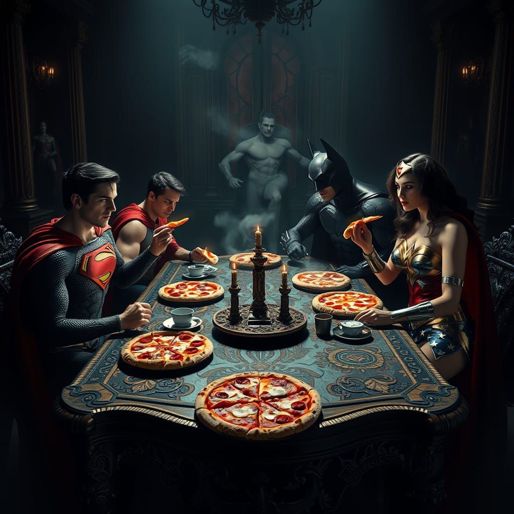 This image shows DC superheroes Superman, Supergirl, Batman, and Wonder Woman eating pizza. The heroes are dressed in detailed costumes, set in a dimly lit room with cinematic lighting, as digital art.