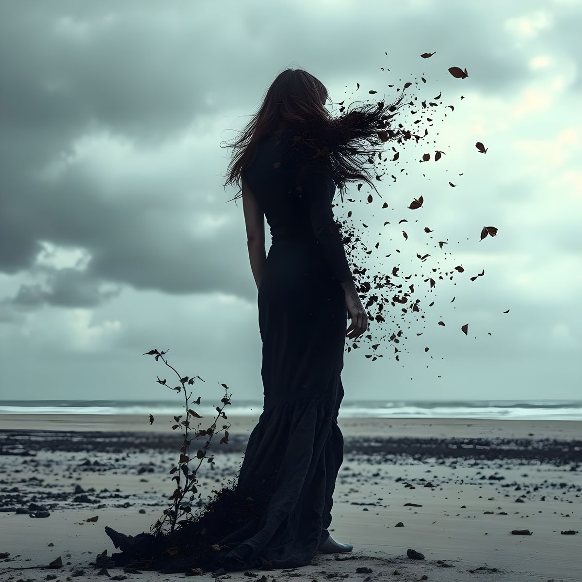This image shows a woman on a desolate beach under stormy skies, her form blending with earth and decaying leaves. A hauntingly beautiful symbol of transformation.