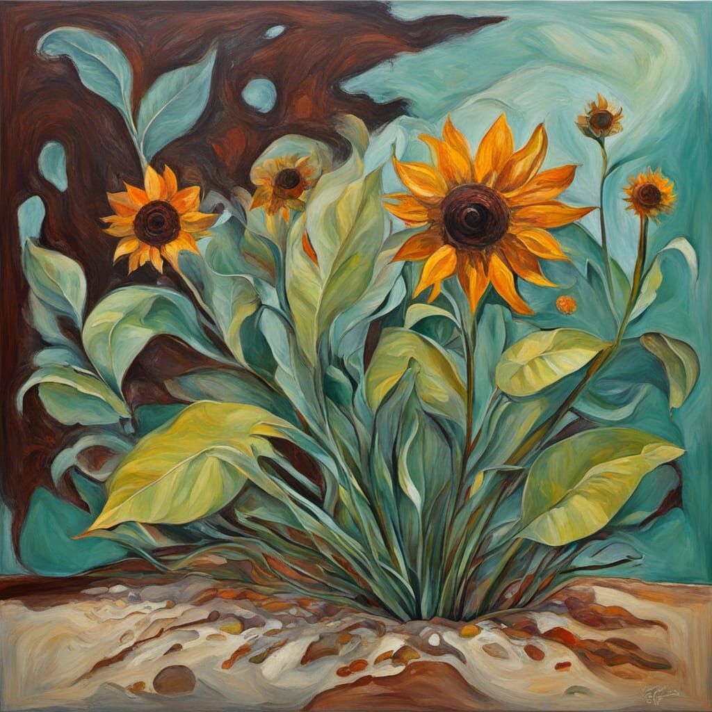 This image is an abstract surrealist painting that blends Bauhaus and Fauvism styles, featuring organic elements like kelp and sunflowers with a palette of sanguine brown and gamboge.