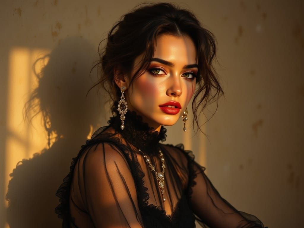 This image showcases a melancholic woman in a dramatic, high-fashion pose, featuring intricate details and luxurious textures. Soft lighting accentuates her refined features and bold, contemplative eyes, set against a serene background.