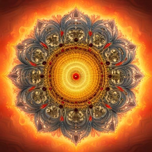 This image shows an intricate mandala with a fiery color palette. The design features red, brown and gold hues in a detailed, maximalist digital painting.