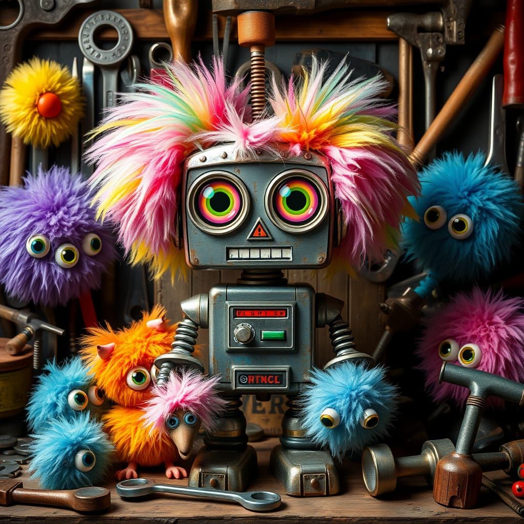 This image shows a whimsical cartoon robot constructed from a vintage toolbox and hand tools, surrounded by fluffy, multicolored creatures in pastel rainbow hues. The artwork features bold lines, vibrant colors, and playful textures.