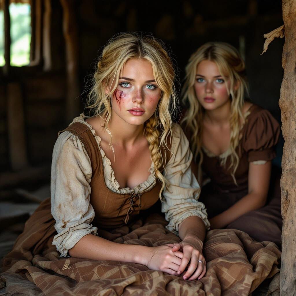 This image depicts a distraught blonde woman in a tattered dress lying on the floor of a hut. Her appearance suggests hardship and injury.