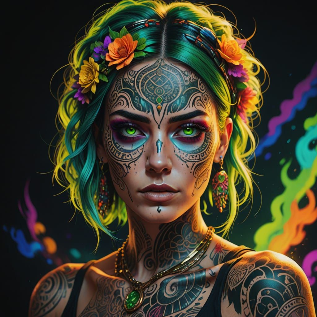 This image is a vibrant digital art piece featuring a close-up of a tattooed woman with rainbow hair and colorful makeup, set against a colorful, gradient background with intricate designs and detailed, textured tattoos.