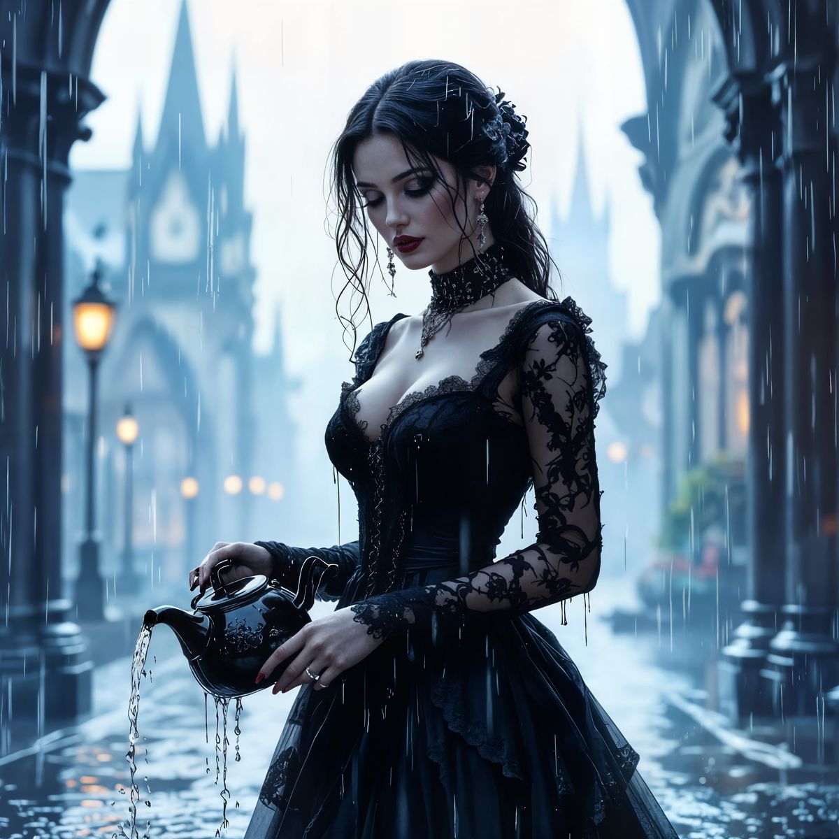 This image shows a hyperrealistic portrait of a goth woman in a black lace dress, standing in pouring rain. The artwork features deep colors and intricate details, reminiscent of fantasy concept art.