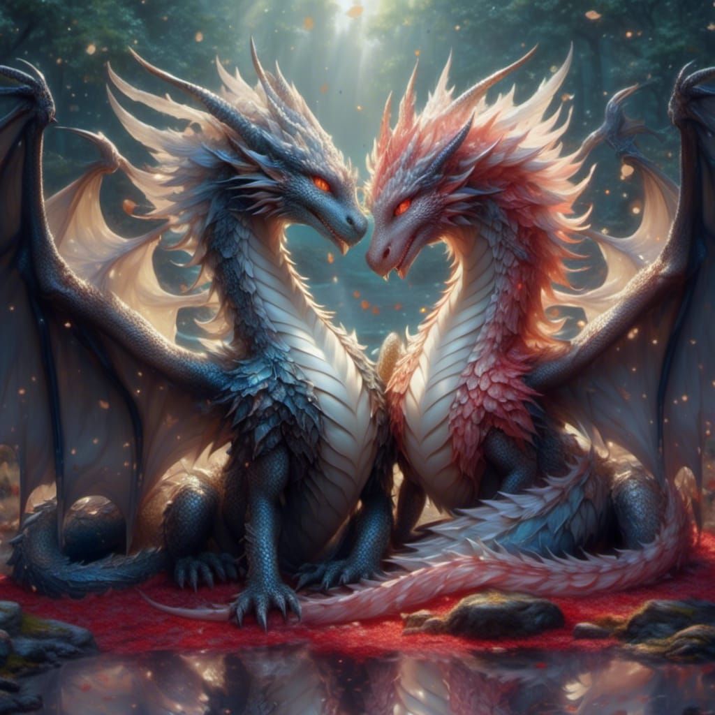 This image shows two dragons in love, mating in a natural scene. The artwork features soft colors, realistic details, and a passionate expression, resulting in a mythical and adorable aesthetic.