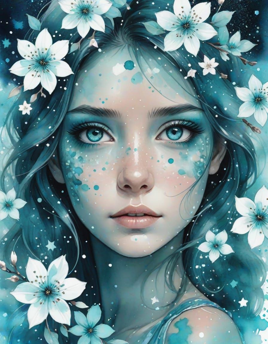 A digital watercolor splash art image featuring aquamarine eyes framed by turquoise stars and cherry blossoms. The artwork is a monochromatic double exposure.