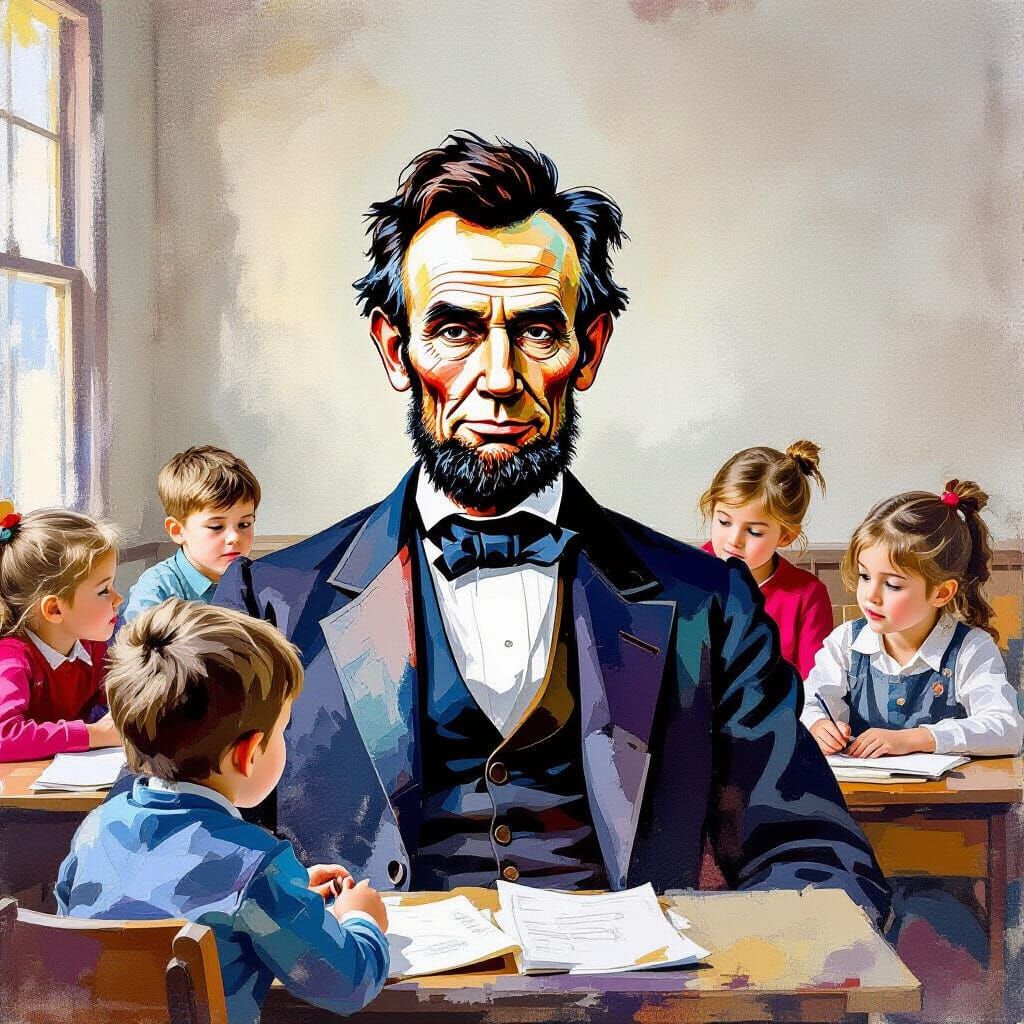 A striking image showing Abraham Lincoln double exposed over children in a classroom. The artwork features thick brush strokes and layered gouache watercolors in an impressionistic style.