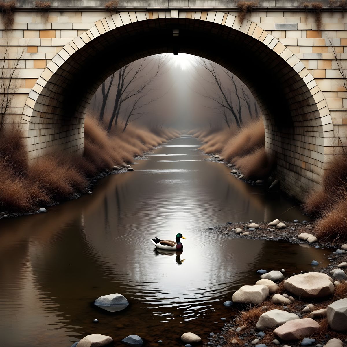 A peaceful winter or early spring scene, depicted in a natural, realistic style. The dark river flows under a light beige stone bridge, with muted tones of beige, brown, and dark grey dominating the color palette.