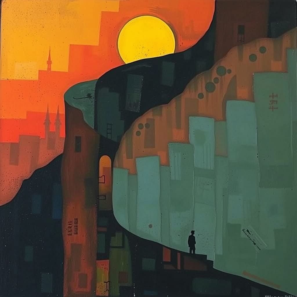 This image shows a cubist, minimalist rendering of golden years, using contrasting colors and acrylic art techniques. It has a storybook illustration aesthetic.