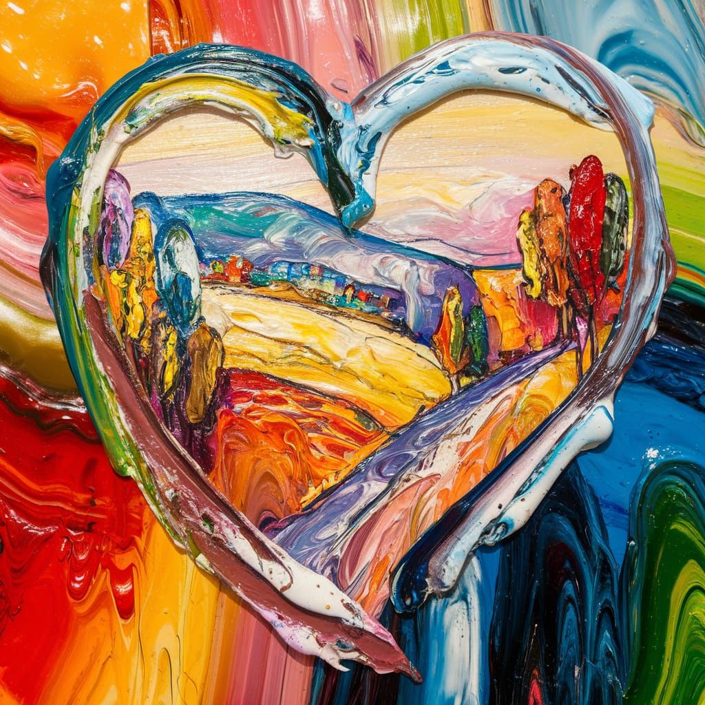 A vibrant neo-impressionistic painting of a love heart. This image features a colourful, textured background with rolling hills, trees, and a road leading to a distant town, created as an impasto acrylic.