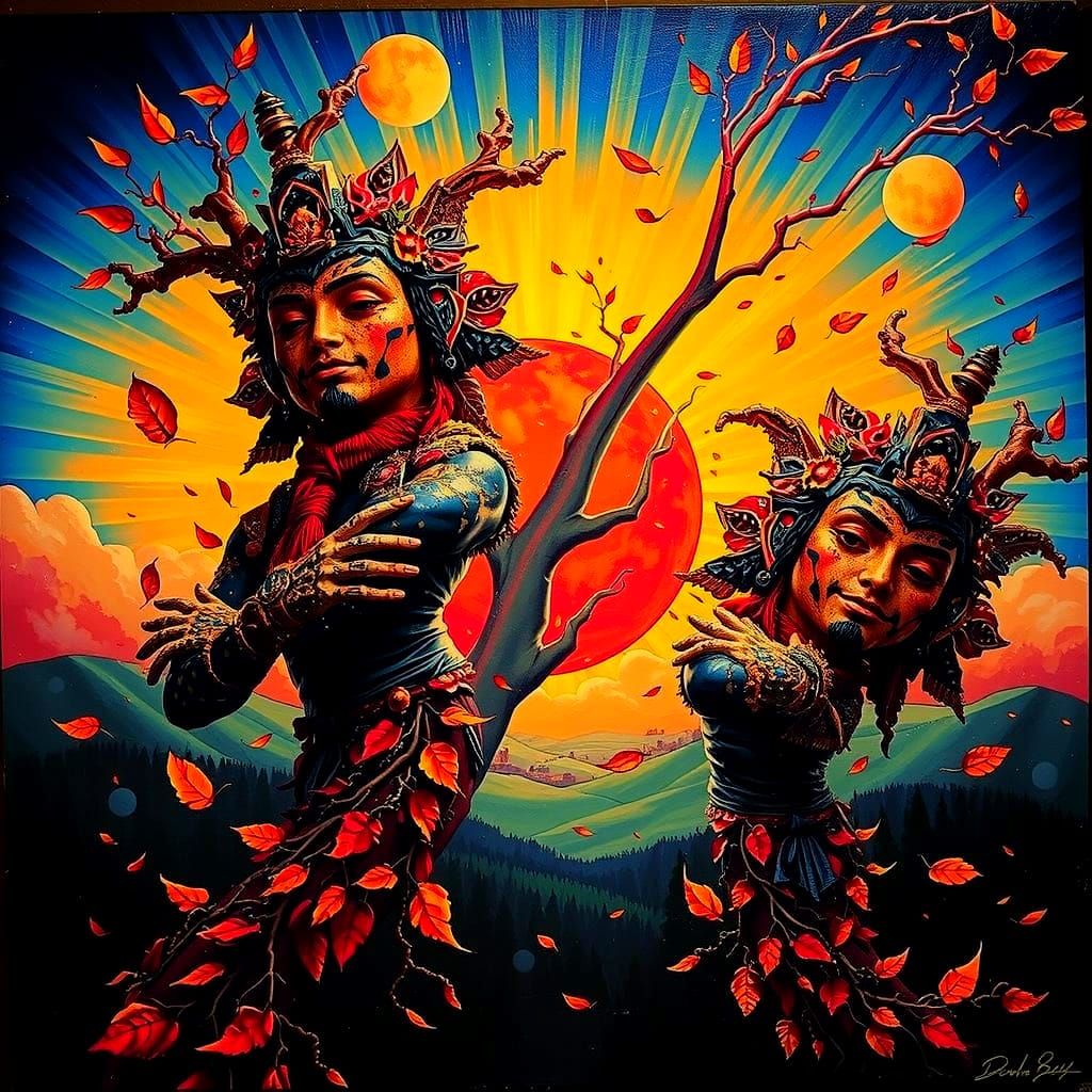 This AI-generated image depicts a surreal landscape with contrasting blue skies, green fields, and red lands, accented by golden leaves and soft white light.