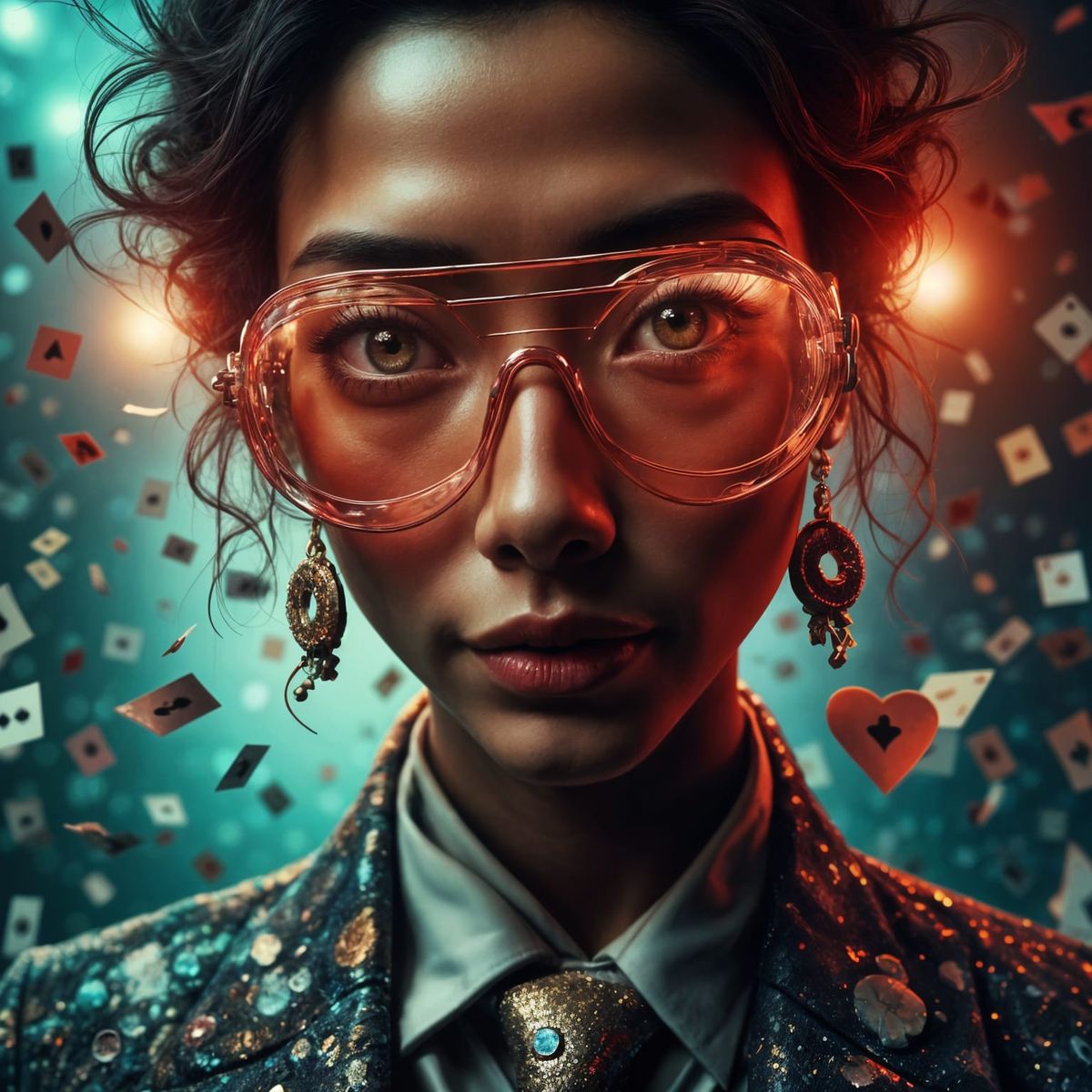 This image shows a hyperrealistic close-up photograph of a woman. The subject has radioactive and fantastical elements with playing card suit, music, key, and bomb icons.