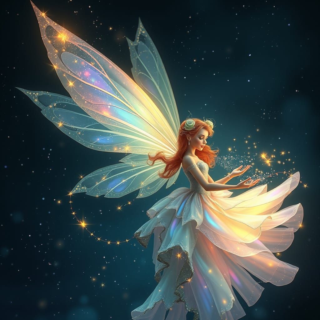A whimsical and ethereal fairy in an iridescent gown sparkles with stardust under a celestial night sky. The art style blends influences of detailed character design and atmospheric landscapes.