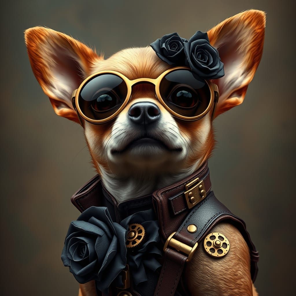 This image shows a Chihuahua dog in an elegant steampunk outfit. The dog is adorned with black roses and brass gears, rendered with detailed textures and vibrant colors in a semi-realistic style.