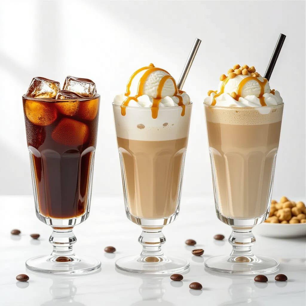 This image showcases four distinct coffee drinks arranged elegantly in a vertical line on a white marble surface with ample negative space and soft natural light.