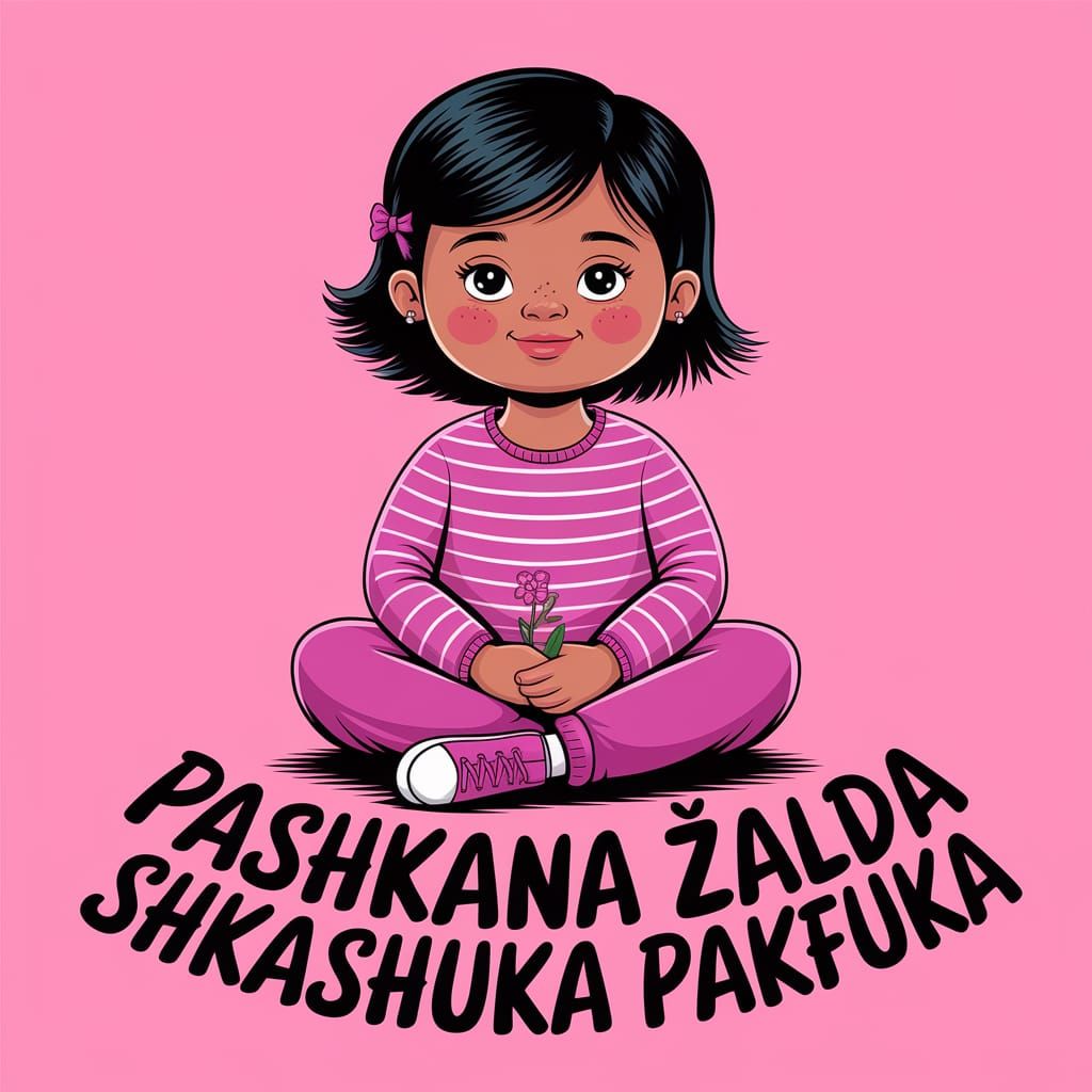 This image shows a modest 3-year-old girl in long clothing. The ground features nonsensical text, adding an element of surrealism to the scene.