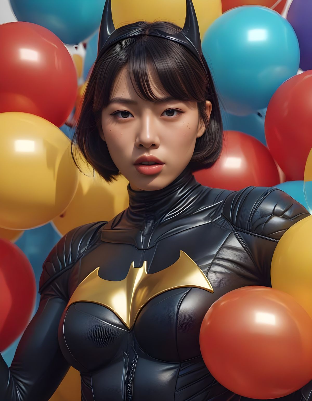 This image shows a muscular Korean woman in a Batman-inspired rubber suit, flexing her biceps amidst a vibrant balloon display. The artwork highlights her physique.