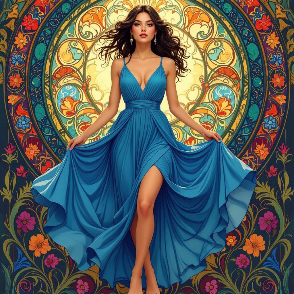 This image shows a beautiful woman in a flowing blue dress, barefoot, with her hair blowing in the breeze. The scene is set against a vibrant, colorful background with hyperrealistic details.