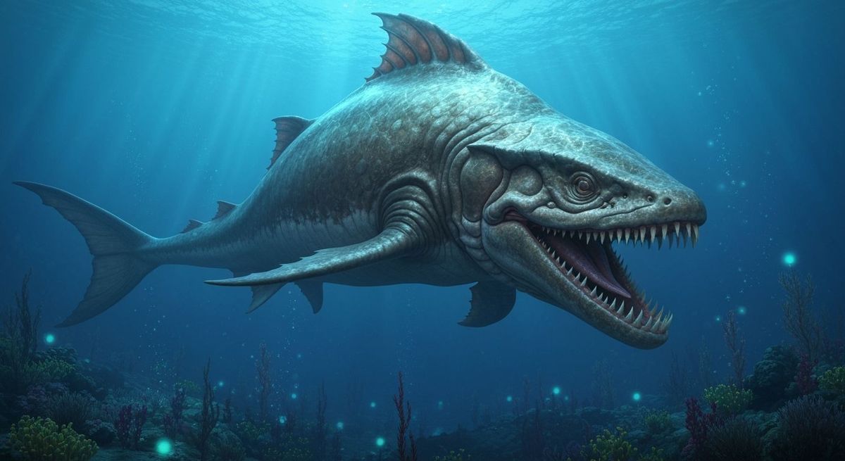 This image shows a hyperrealistic rendering of an ancient, colossal marine animal resembling a whale ancestor. The creature has textured skin and a massive body, set against a backdrop of bioluminescent deep-sea life.