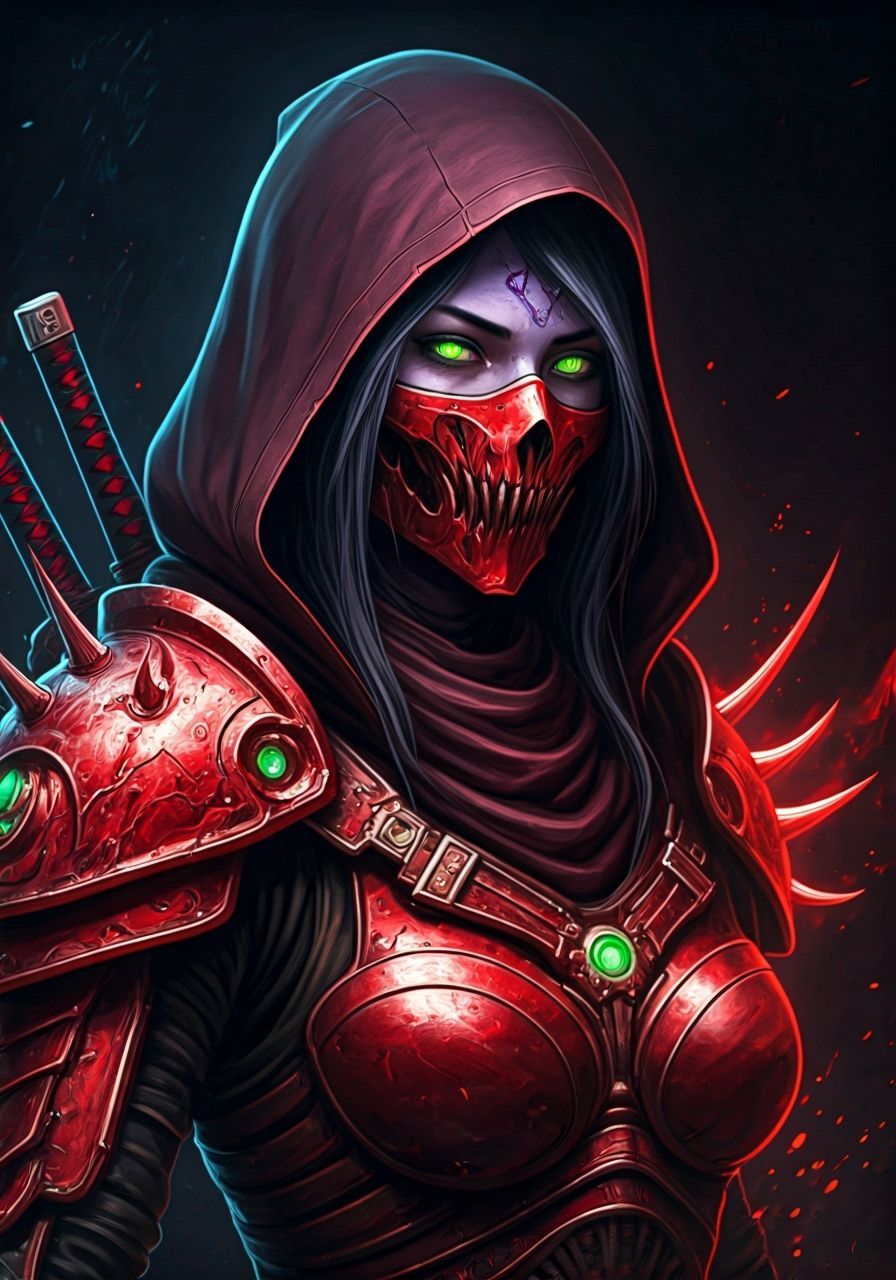 A biomechanical ninja warrior stands ready for battle in a dark fantasy setting. The image features vibrant colors, cosmic elements and mixed media textures, with a futuristic aesthetic.