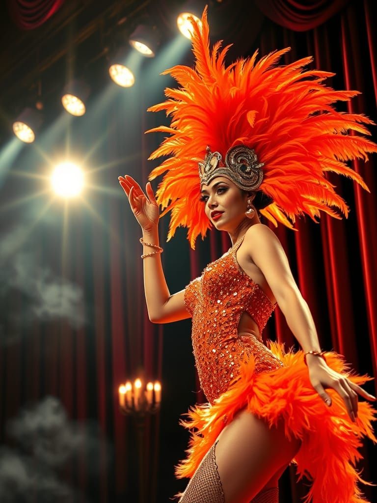 This image shows a showgirl in a shimmering orange sequined costume and feathered headdress on a cabaret stage. The digital art piece features vintage glamour, dynamic lighting, and a smoky atmosphere.
