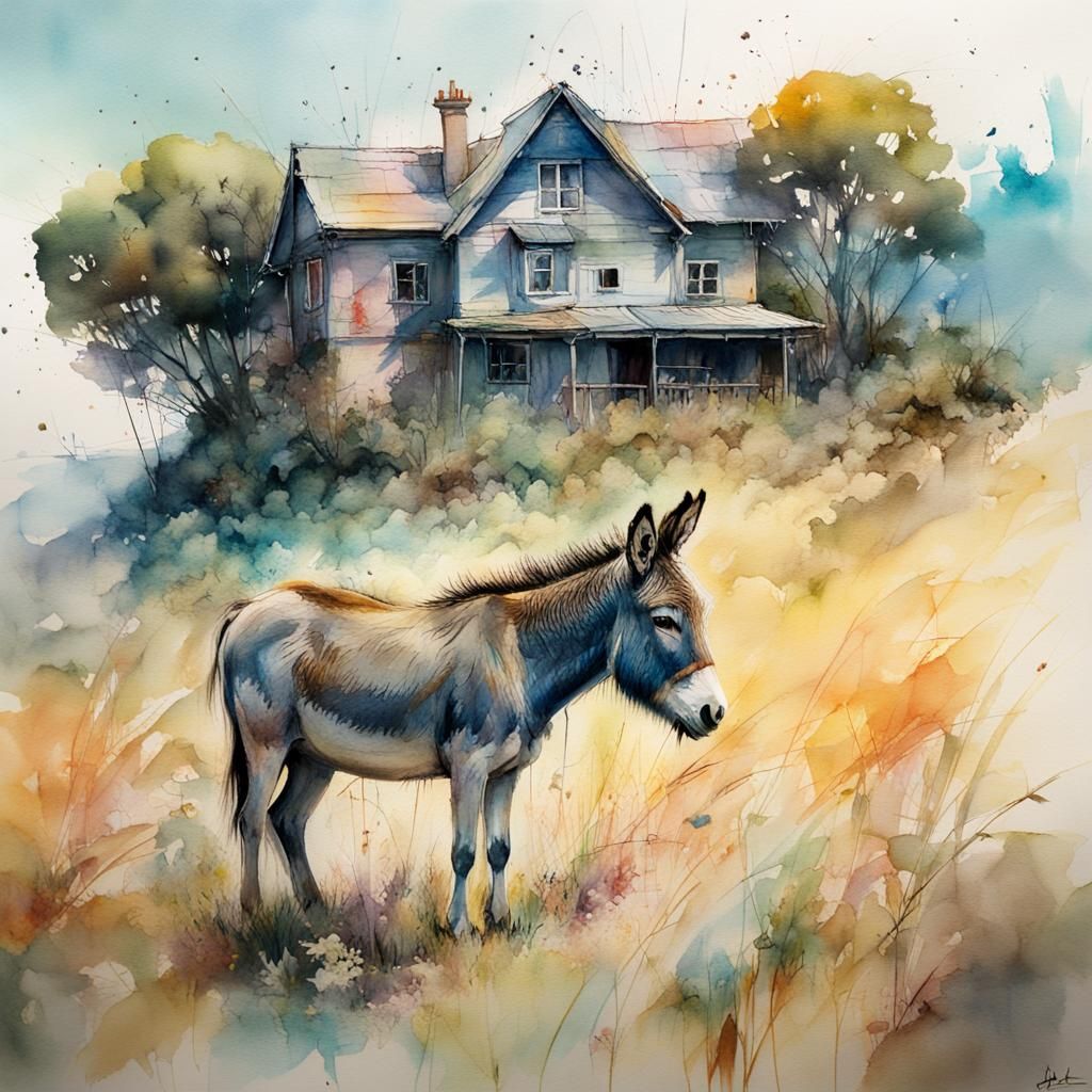 This image shows a house on a hill with a donkey in a field. The artwork features stylized watercolor techniques, intricate details, and soft cinematic lighting with pastel colors.