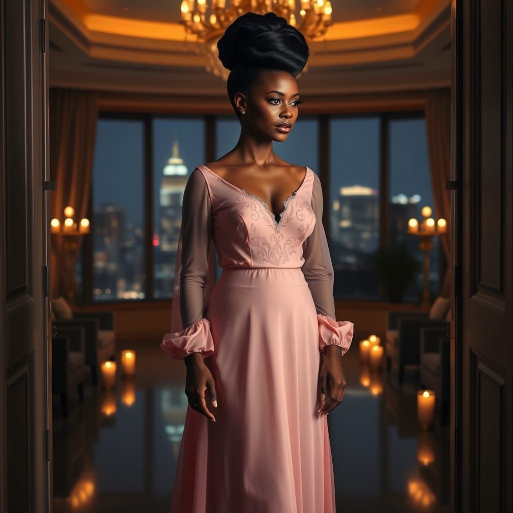 A photorealistic portrait of a graceful African American woman in a flowing pink silk gown, standing in a luxurious room with a city skyline view.
