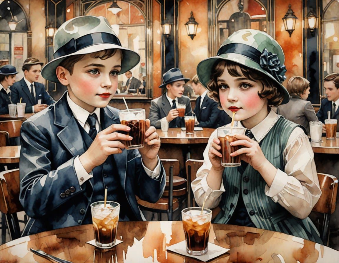 This image shows two children in 1920s attire enjoying Cokes in an Art Deco café. The mixed media illustration features watercolor backgrounds and textural collage elements.