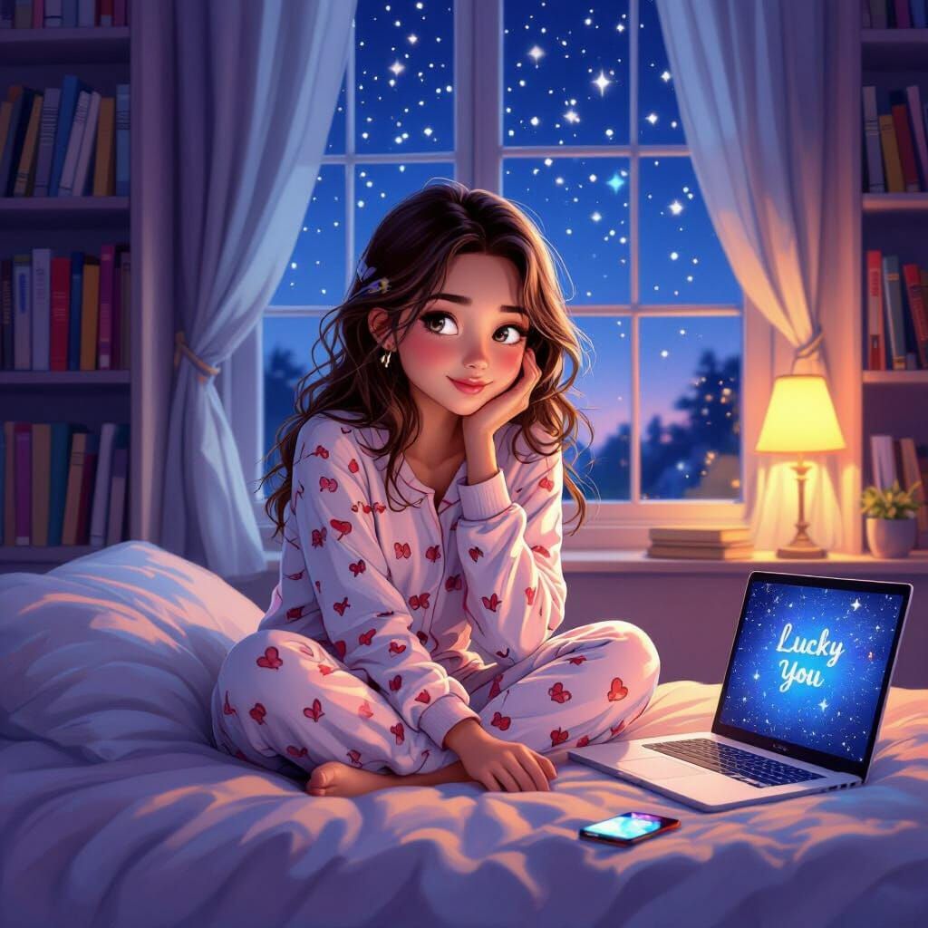 She sits quietly on her bed, pajamas soft and warm, the stars sparkling through her window as if whispering secrets. A laptop glowing ‘Lucky You,’ books stacked with untold adventures, and dreams drifting into the night sky. ✨ This dreamy world was imagined and brought to life by DreamFrame Studio 💫