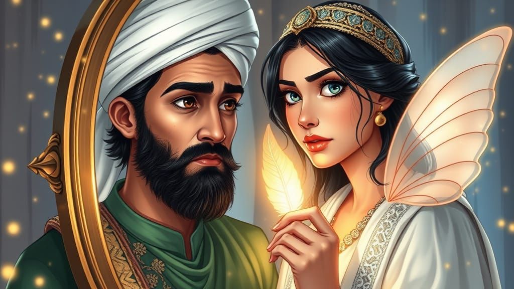 This captivating image shows an ancient warrior questioning a radiant fairy in a mystical 4K reflection, surrounded by magical colors and shimmering walls.
