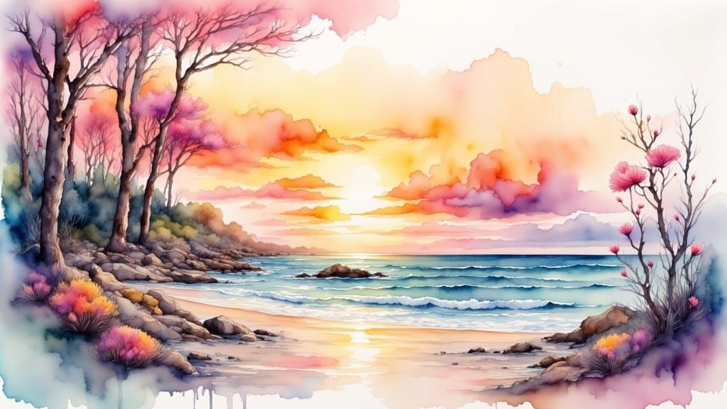 A stunning image of a relaxing, gentle slighlty rocky beach at sunset. A <lora:MrsH Watercolor:1.0> fluid style of traditional watercolor pa...