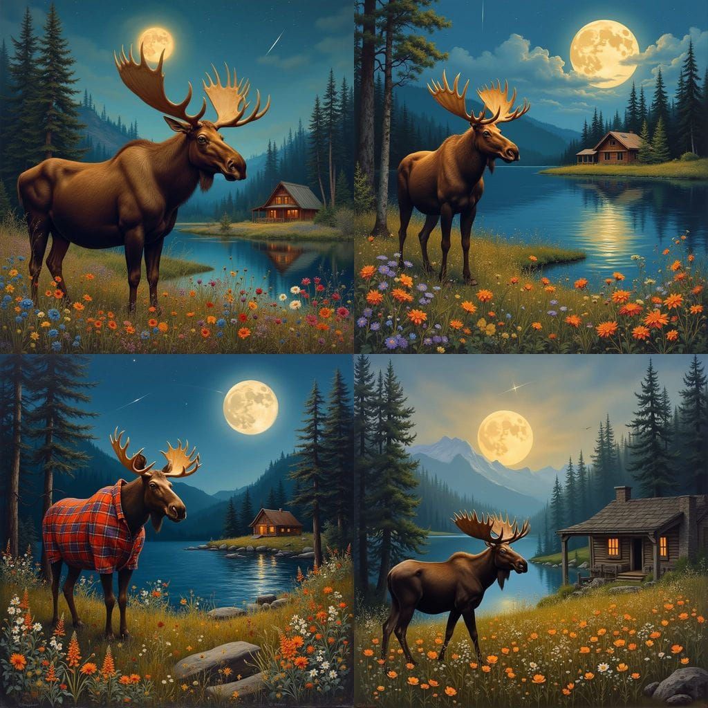 Create your own stunning wildlife scenes! It's free and easy to generate images of moose, cabins, and moonlit landscapes.