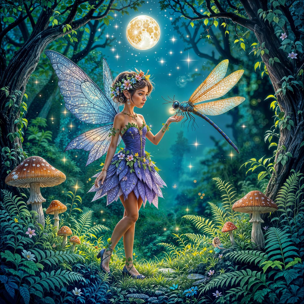 This image shows a beautiful fairy in a purple dress with floral jewelry in a magical, moonlit forest. A large, glowing blue and gold dragonfly is present, with the fairy interacting with it.